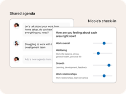 We believe in shared ownership between the manager and the direct report when it comes to 1-on-1 meetings. As we mentioned before, employees should be the ones to set and drive the agenda, but managers need to be involved in the process as well. To encourage this collaborative relationship, our platform provides a 1-on-1 space where shared agendas can be created and managed.