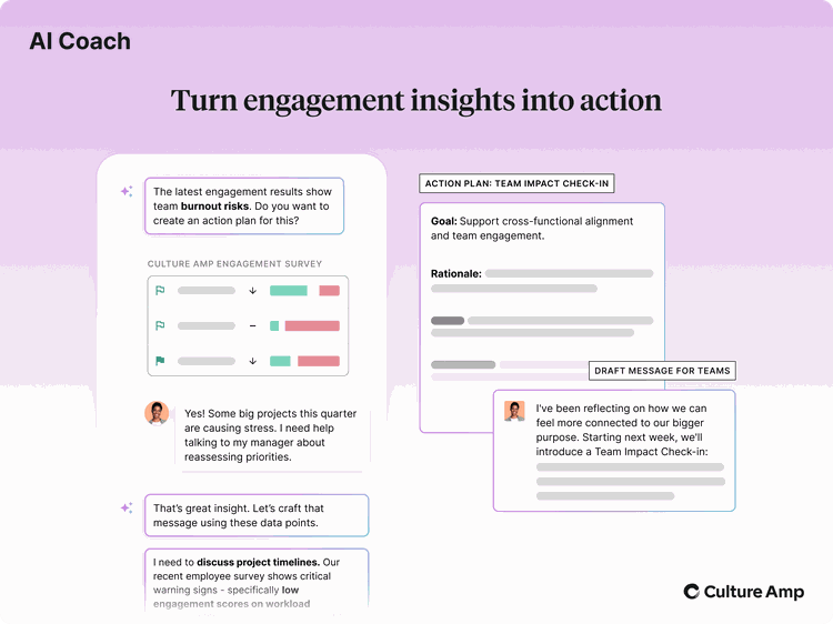 Streamlining the way HR teams review and act on engagement surveys, using AI Coach together with Engage, managers can swiftly review highlighted survey insights, identify recommended focus areas for their teams and organization, develop meaningful action plans, and be prompted to use other Culture Amp tools such as Goals and 1-1s that drive engagement and performance.