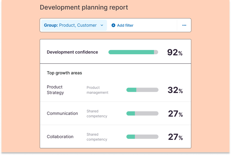 - Development insights: Identify the most pressing development needs across your business. You will be able to easily analyze strengths and gaps in company- and role-specific competencies to direct your L&D programs and talent processes.