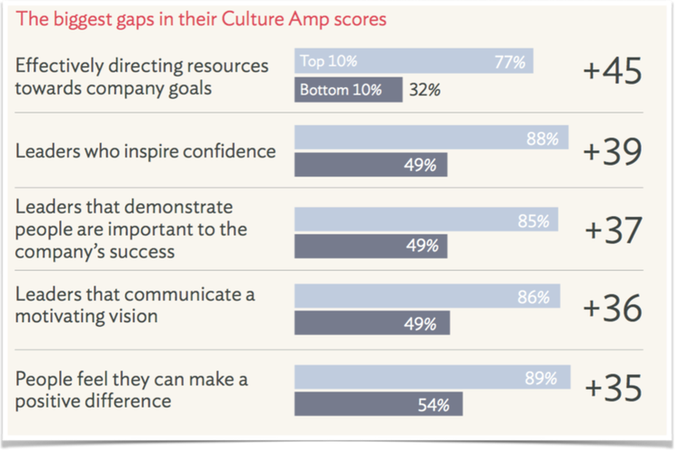 When comparing scores on five survey items that impact engagement, the impact of communication is clear. The chart below shows the top 10% of highly engaged companies versus the bottom 10%. The top four items all involve communication. For example, Culture Amp’s research has found that companies who get high scores on the first item not only direct resources well but do a great job communicating decisions about resources to the whole company.