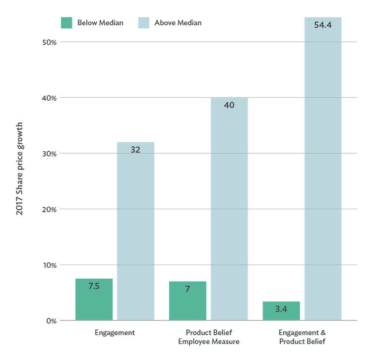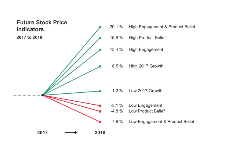- The combined effect of engagement and product belief was even stronger. Higher engagement and product belief was associated with 51% higher share price growth.