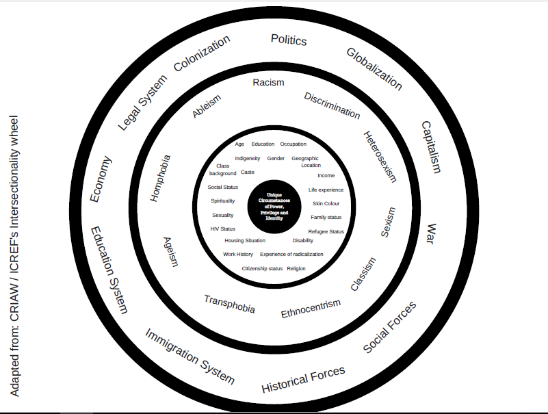 The CRIAW / ICREF Intersectionality Wheel is extremely useful for understanding the different intersections and how our current power structures reinforce various forms of discrimination. It explains that certain facets make up every person’s identity, including: