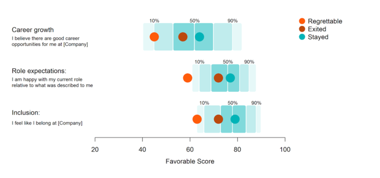 In the table below, you can see this pattern for the 3 main drivers of attrition. The favorable scores of employees marked as regrettable exits were low enough to be placed within the bottom 10th percentile of our global benchmark data.
