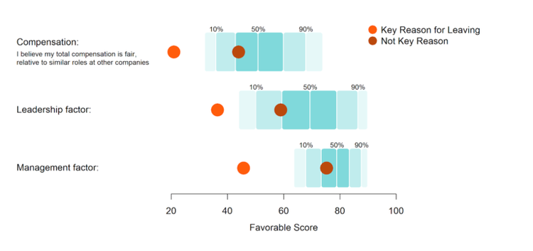 - Similarly, employees who selected “Leadership” as their key reason for leaving scored below the bottom 5th percentile on the Leadership factor.