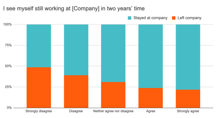 - Those who strongly disagreed were 2.7x more likely to leave than those who selected other response options. This effect was twice as strong for regrettable exits since they are more honest about their intentions!