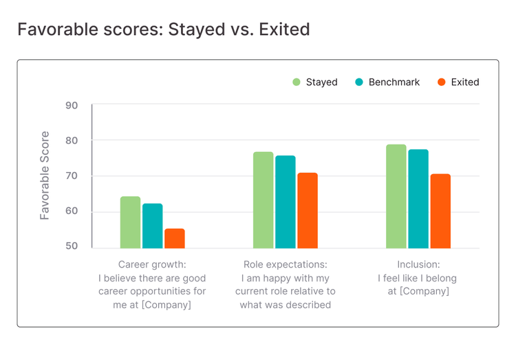 - Career growth: Employees who left were less favorable on the question “I believe there are good career opportunities for me at [Company].” Additionally, a lack of Growth (in their career or development opportunities) was selected by 1 in 3 employees as a top reason for leaving at the time of exit.